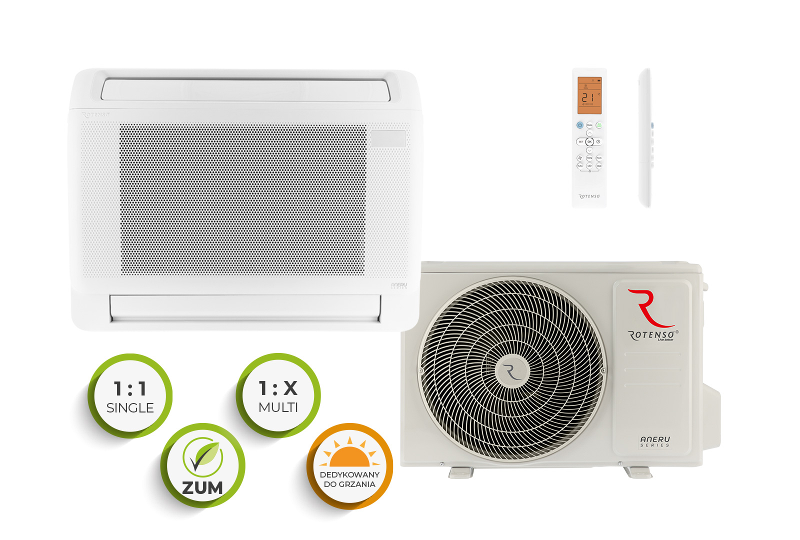 Rotenso Aneru ir konsoļveida gaisa kondicionieris, kuru, pateicoties abpusējai izplūdei uz augšu un uz leju, var uzstādīt tuvu grīdai. Pateicoties unikālajam dizainam, gaisa kondicionieris ir piemērots lietošanai telpās ar īpašiem ierobežojumiem, piemēram, ar daudzām gāzēm un zemām sienām, piemēram, bēniņos. Aneru ir arī populāra izvēle klientiem, kas vēlas izvairīties no iekārtas eksponēšanas pie griestiem.