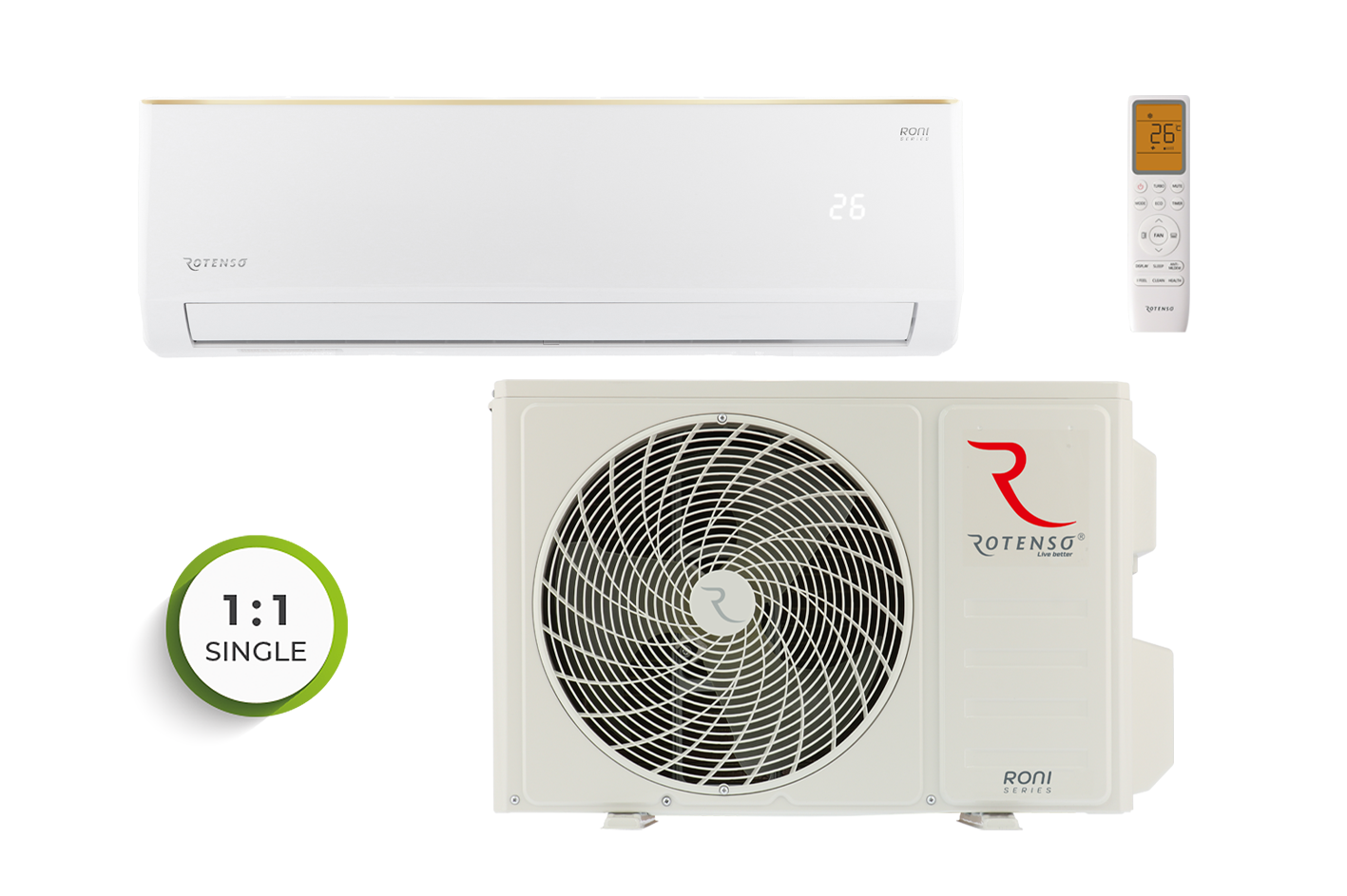 Roni modelis ir ļoti populārs Rotenso klāsta modelis. Tā priekšrocība ir nelielais izmērs, kas ļauj to diskrēti uzstādīt, jo īpaši, ja ir ierobežota telpa. Optimāla veiktspēja un svarīgāko funkciju pakete padara Roni gaisa kondicionieri par lielisku izvēli. Klasiskais baltais izskats, kas maigi lauzts ar zeltītām līnijām, lieliski iederēsies gandrīz jebkuras telpas interjerā.