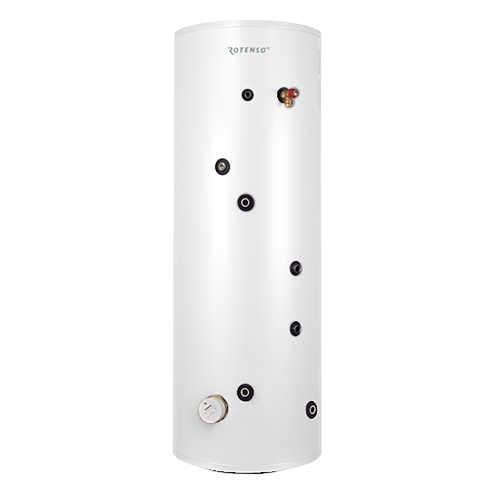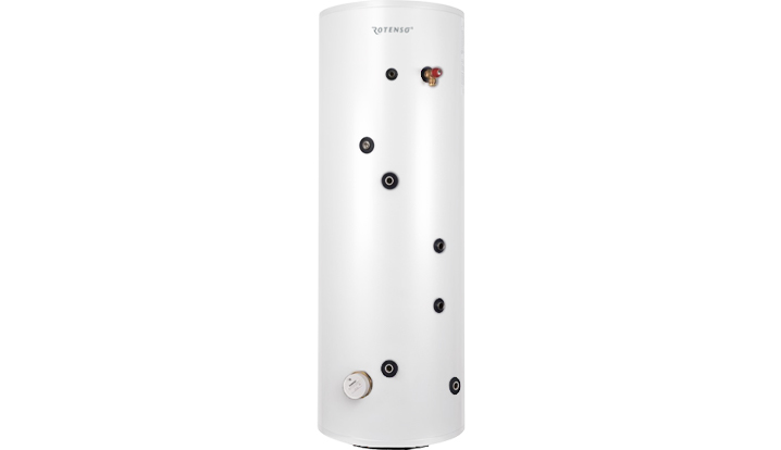 Sadzīves karstā ūdens tvertne ar lielas virsmas spirāli, kas sadarbojas ar siltumsūkņiem.
