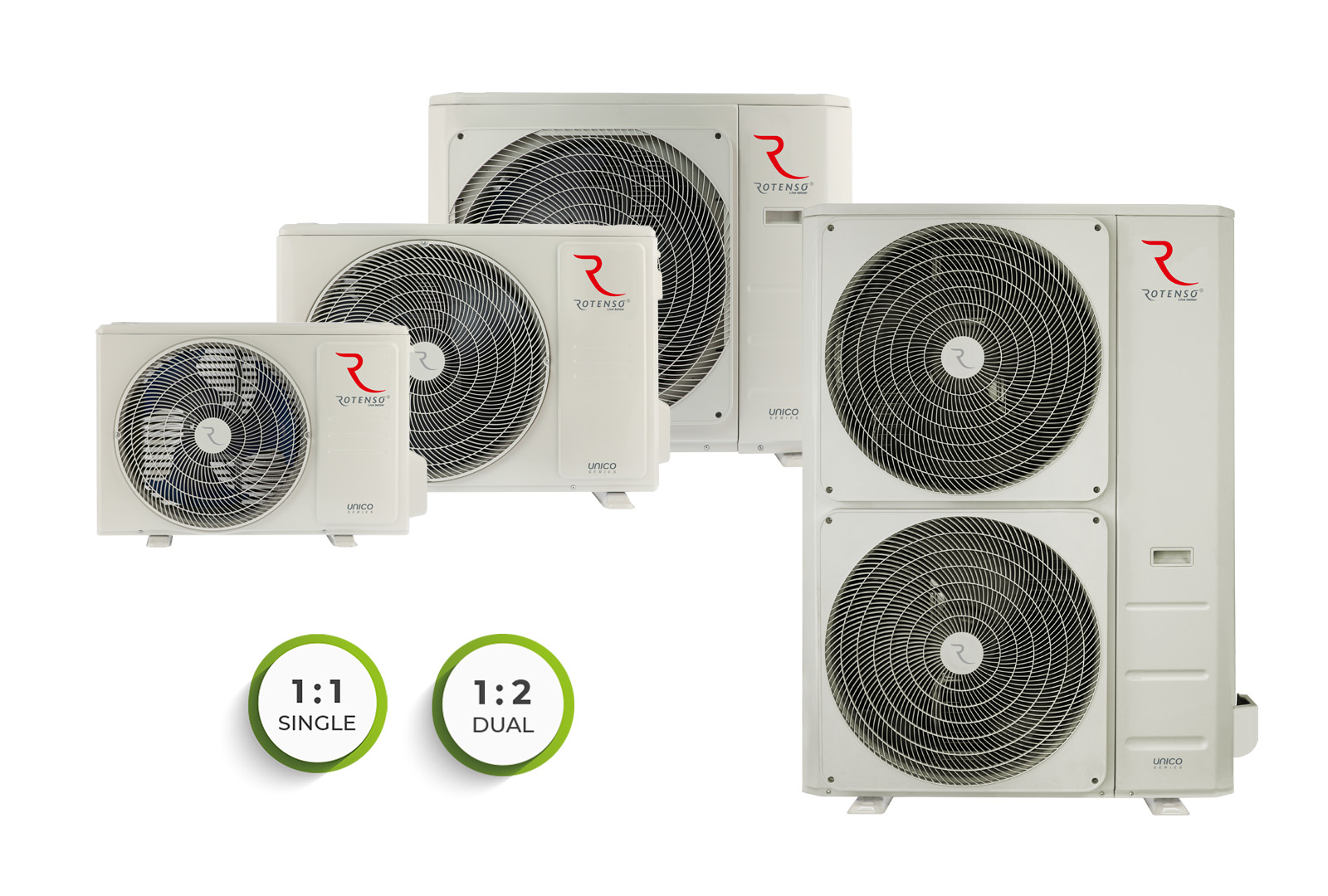 Vienība ir pieejama astoņu jaudu (no 3,5 kW līdz 15,5 kW), A++ dzesēšanas klasē. Tas ir aprīkots ar BLDC invertora rotācijas kompresoru, kas garantē vēl nebijušu efektivitātes līmeni un optimizētu darbību. Atkarībā no pieprasījuma iekārtas vadības sistēma izvēlas vienu no 30 kompresora frekvences diapazoniem, apvienojot maksimālu efektivitāti un minimālu enerģijas patēriņu. Šis mūsdienīgais risinājums nodrošina ilggadēju, energoefektīvu Rotenso Unico ekspluatāciju bez traucējumiem – pat aukstā ziemas laikā.